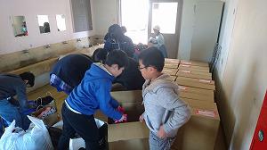 保護者の皆様、地域の皆様のご協力のおかげで、たくさんの服を集めることができました。トラックに乗せられた箱を見て、何人かの児童が