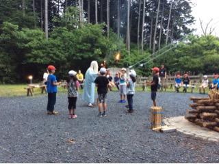 山の中から火の神が現れ、4年生のみんなに8種類の火を授けてくださいました。その後、司会者や係が進行をして、歌やゲームを行いました。みんな、キャンプファイヤーの炎を見ながら、色々なゲームを楽しみ、最後は「遠き山に火は落ちて」合唱しました。