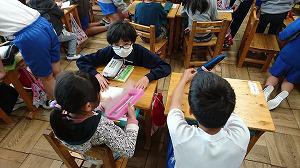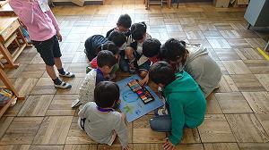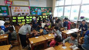 本日の業間に、「なかよし班編成」が行われました。1年生も交えて新しい「なかよし班」の顔合わせをしました。最初に自分たちで作成した名札を使って自己紹介をして、その後、6年生が準備したメダルのプレゼントが2年生から1年生に贈られました。そして、この1年間の「なかよし班活動」でどんなことをしたいかを話し合い、最後にそれぞれの班のシンボルマークを決めて、ボードに作成しました。