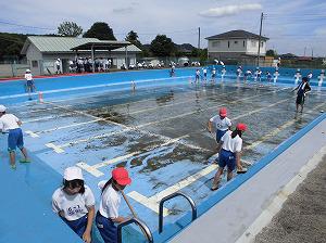 本日の午後に、雨のためにずっと延期されていた「プール清掃」を行いました。4年生がプールの周りの所像、5年生がプールサイドの除草、6年生がプールの中の掃除を行いました。4,5年生は、地面にしっかりと根付いている草を、一生懸命に抜きました。6年生は泥だらけで汚れがこびりついているプールの中を、ブラシで一生懸命にこすりました。暑い中でしたが、みんな集中して作業を進めました。