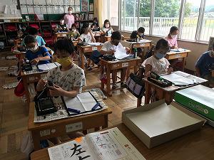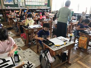 6日ぶりの学校です。4年生は、2校時板橋先生との習字です。「麦」の清書でした。ポイントを確認し、水書板で書く様子を見てから始まりました。