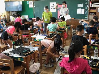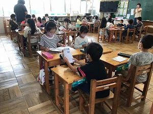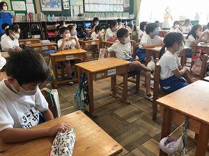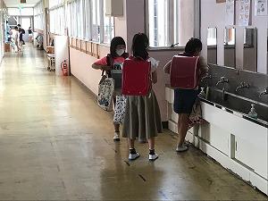 いつものように朝の手洗いや検温チェックです。登校後の手洗いをしてから、ランドセルを開けてのチェックです。5,6名の子が忘れてしまったようで、検温も月曜日が課題になります。大部分の子どもたちはできていましたので、引き続き新しい生活様式へのご協力をお願いします。