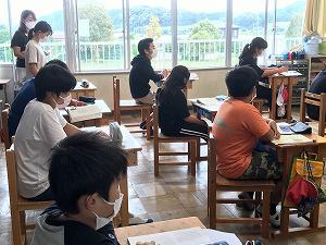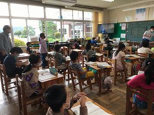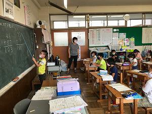 2年生は、2校時算数の学習で、担任の菱沼先生、学力向上担当の加藤先生、支援の川田先生の3名の先生方に教えてもらいました。まとめの後の復習をする場面でした。数直線に数字を書く問題やdL、L、mLの問題、足し算・引き算の問題です。分からない子に寄り添いながら、丸をつけながらです。頑張っていた2年生でした。
