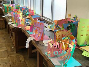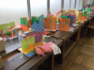4校時、図工でした。紙をカッターで切って家を作る活動の仕上げでした。出来上がった作品が並びました。
