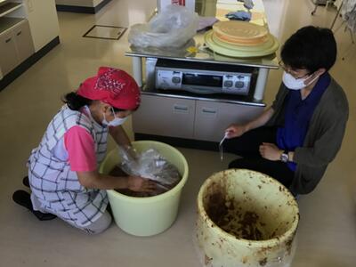 昨年度の3年生(現4年生)が3月に仕込んだ味噌が熟成していますが、児童に配る来年までそのままにしておくと、味が均一になりません。そのため、毎年夏休みに福田さんが来てくださり、味噌を別の樽に入れ替えて、上下が逆になるようにしてくださいます。