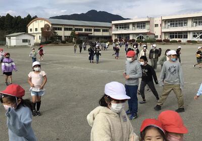 「休み時間中に理科室から出火し、2階にいた職員が火災に気付いた」と想定して訓練を行いました。訓練開始時には、児童の半数くらいは校庭に出て遊び始めており、残りの児童は校舎にいました。避難指示を受けてから、全校児童の避難が完了して全員の人員確認が終了するまで、3分間余りでした。