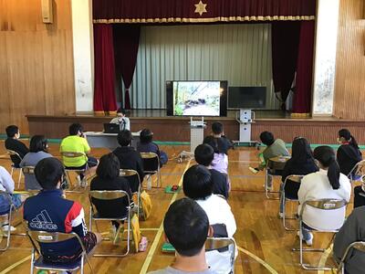 前半は、パワーポイントで山地災害についての説明を聞きました。鹿沼市内で過去に起きた災害の写真や動画なども見せていただき、子供たちは真剣に見入っていました。