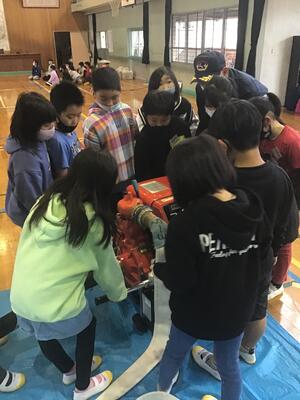 次に、3時間目は、体育館で消防体験をしました。ホースを転がしてまっすぐに伸ばしたり、水消化器を使って消火体験をしたり、防火服を着てみたりしました。