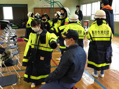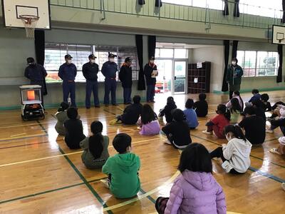 本日(12月8日)、鹿沼市消防本部と第5分団消防団の皆様に御来校いただき、3年生に消防体験をさせていただきました。
