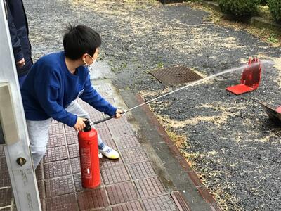 防火服が予想以上に重くて驚いていたようでしたが、みんな誇らしそうでした。「教室でも着ていたい。集中して勉強できそう。」と話している児童もいました。体験の中では、特に、水消火器を使った体験が楽しかったようです。