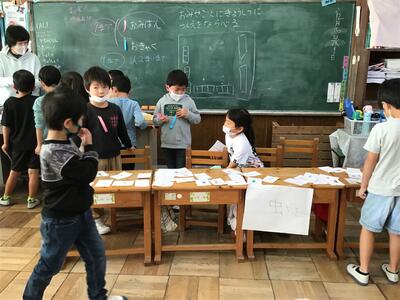 売り買いのごっこ遊びを通して、言葉の使い方の間違いに気付いたり、友達に教えてあげたりする姿が、あちらこちらで見られました。子供たちはみんなで楽しく生き生きと活動しながら、たくさんのことを学んでいます。