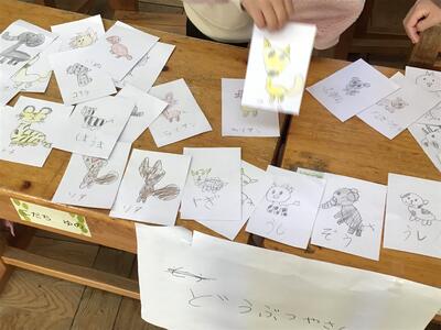 12月15日(水)、その学習のまとめとして「おみせやさんごっこ」を行いました。子供たちが3時間かけて作った、たくさんの力作の「言葉カード」を机の上いっぱいに並べて、交互にお店の人とお客さんになりながら行いました。