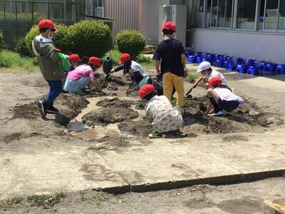 田んぼの状態に近くなるように土を丁寧にほぐしたり、鳥に食べられないようにネットを掛けたりする作業を、子供たちは一生懸命がんばっていました。