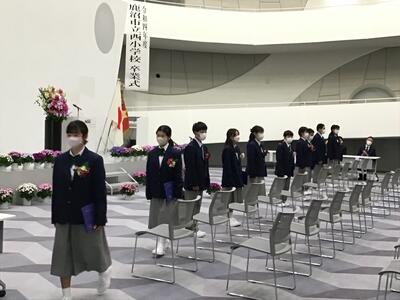 3月17日(金)、西小学校第52回卒業式を挙行しました。現在、体育館が改修工事中のため、(株)ナカニシ樣の御厚意により、素晴らしいホールを会場として使用させていただいて行いました。