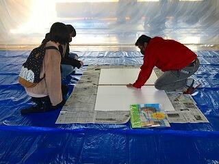 パネル製作が順調に進行しています。市民会議の役員の皆様によるペンキの準備があって、ご希望の色を調合されたものを使っての作業です。PTAや育成会の役員、東大芦コミセンの職員の方々のご支援のもとに行われています。ありがとうございます。