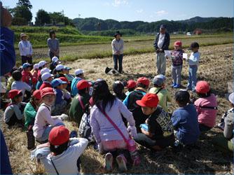 子どもたちは慣れない鎌を持って、熱心に稲刈りをしました。