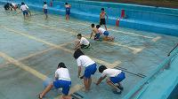 いよいよ水泳の季節が到来するということで、西小では本日、子ども達によるプール清掃が行われました。あらかじめ体育主任が水槽内の落ち葉や泥をおおかた撤去し、先日のPTA早朝草刈り作業でフェンス周りやプールサイドの除草をしていただき、最後に今日5、6年生が仕上げる形で掃除が始まりました。