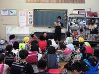 次に、人権擁護委員の方々から代表児童2名に目録と花が贈呈され、全校児童に向けた講話をしていただきました。