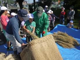 学校の道具小屋から運び出した2台の脱穀機を使いました。足踏み式の脱穀機に刈り取ったイネの束をかけると、乾燥した稲穂から、籾(もみ)が次々とはじかれて、手には藁(わら)が残りました。お借りした田んぼで刈り取ったイネの一部をお持ちいただいたそうですが、子ども達が2台の脱穀機を使って、30分くらい時間がかかりました。残った藁(わら)は、学校で保管して、学校農園で行う来年の野菜作りで、畑に敷いて活用する予定です。