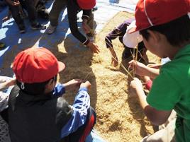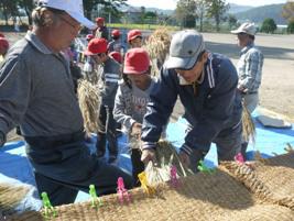 秋晴れの天気に恵まれた今日の2校時、校庭で、2年生と5年生が「脱穀体験」をしました。