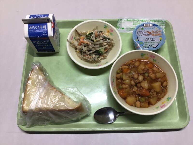カミカミこんだて メープルトースト ぎゅうにゅう チリコンカン チキンごぼうサラダ レモンゼリー