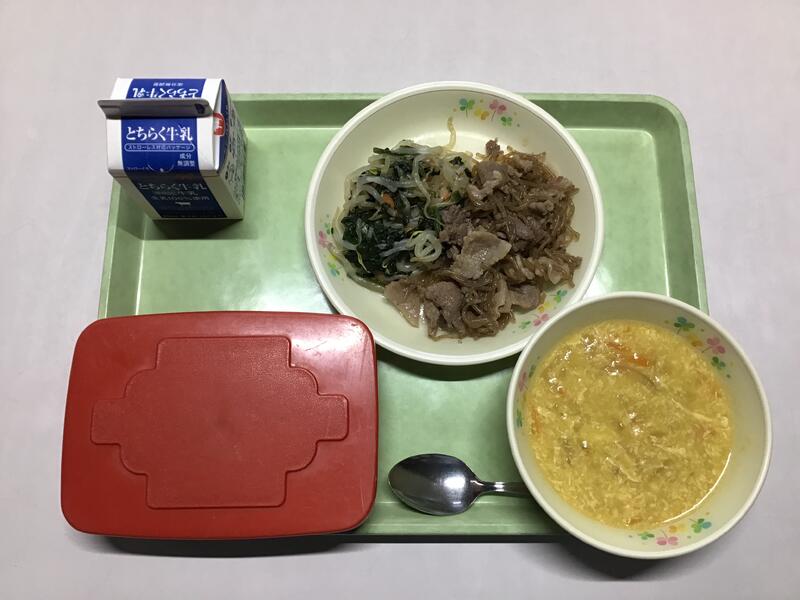 ごはん ぎゅうにゅう けんさんぶたにくにらいりぎょうざ チャプチェ チャンポンスープ