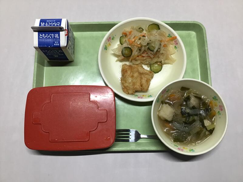 (4年生)モロのたつたあげ、にらいりおひたし、けんみんのひゼリーがおいしかったです。完食しておかわりしました。