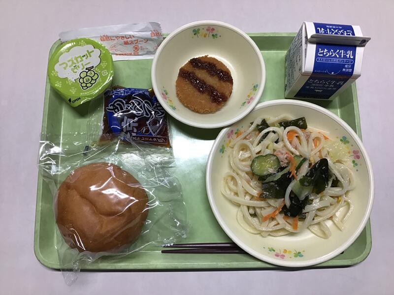 げんりょうまるパン(スライス) 牛乳 ハムカツ サラダうどん マスカットゼリー