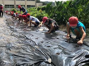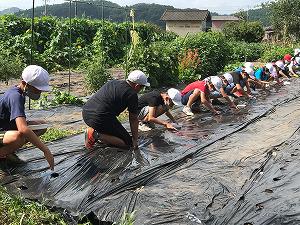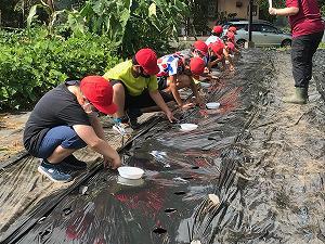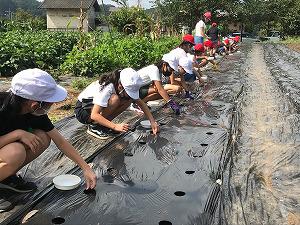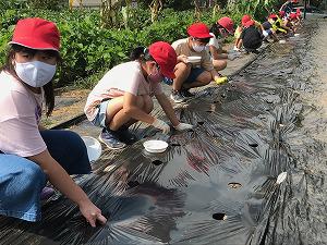 5年生は、2校時総合的な学習の時間に、大根の種まきをしました。昨日のマルチ張りに引き続いての種まきです。マルチの1つの穴に3つぶを大根の種をまきました。成長のようすを観察しながらの収穫になります。今年の育ちはどのようになるか、今から楽しみです。
