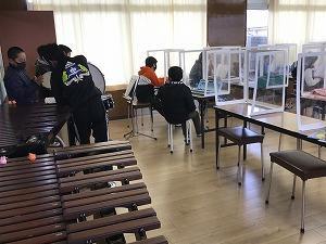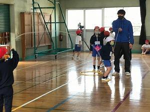 1年生は2校時、体育館での体育でした。お邪魔したときには長縄とびを3カ所で行っていました。細谷先生、粂川先生、湯田先生がそれぞれの片方を回し、3分間ずつローテーションで移動して跳んでいました。男の子よりも女の子が上手で、タイミングを見計らって跳んでいる姿が真剣そのものでした。