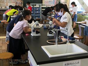 5年生は、4校時理科の観察でした。雄花の花粉を顕微鏡で観察しました。花粉をセロテープにつけて、スライドガラスに貼りました。対物レンズは背の低いものを選んで、触らない程度下に下げてから上に移動させていきます。「見えた」という声があちらこちらから聞こえてきました。