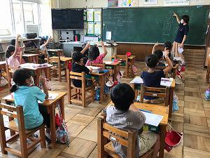 1組では、5校時チャールズ先生との外国語でした。「What animal do you like?」「I like ◯◯.」「Where ◯◯ live?」「◯◯ live in the △△.」といった会話が展開されていました。最後に、近くの級友との会話でした。しっかり学んでいました。