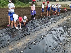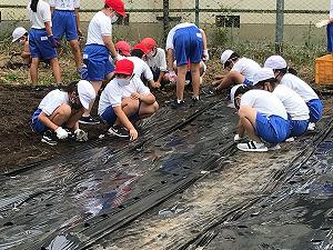 3校時、農園でマルチ張りの作業に取り組みました。小髙先生や湯田先生にも協力していただき、全員でシートを押さえて張ることができました。下沢の福田朗さんが2度耕してくださったので、大根の種まきができそうです。