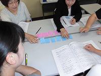 初めに、受講生13人が、自分自身の思春期を振り返り、“ほろ苦い経験”と“甘酸っぱい体験”を2色の付箋紙に書き出して、グループ内で発表し合いました。続いて、全部を合わせてホワイトボードに貼ってまとめ、分類しました。そうすることで、「思春期の複雑な心情」を当時の自分自身に重ね合わせ、親となった今、子どもにどう接するべきかに思いを巡らせ、これから思春期を迎える我が子との向き合い方に一筋の光が見えたような時間となりました。