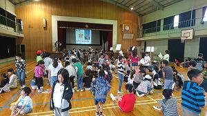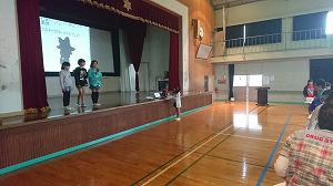 始めに代表児童の素晴らしいあいさつがあり、その後「ゆるキャラシルエットクイズ」が行われました。県内の有名なゆるキャラをシルエットでうつし、キャラクターの名前を答えました。可愛いキャラクターが一杯で、下級生を中心に盛り上がっていました。