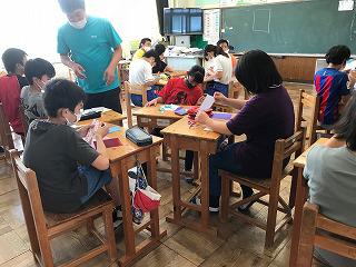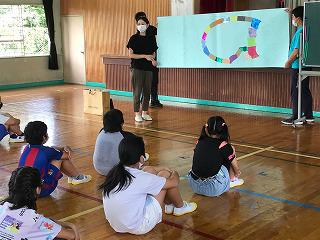 3校時、「虹色のさかな」という学習をしました。ボランティアの神山さんに来校いただき、自宅で水色の大きな紙に作成していただいた魚に、折り紙で作った「うろこ」に願いを書いていくという学習です。50周年記念行事として、また新型コロナウイルスへの対応として企画していただいたものです。6年生への説明とともに、「うろこ」に願いや希望等を書いていく活動が1年生から5年生も実施していきます。今後、6年生が説明することになりますので、どうぞご期待ください。