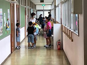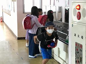 登校後の手洗いや検温のチェックです。シャボネットを使っての手洗いですので、保健委員会の子どもたちが補充をしています。学校のために頑張っていました。検温のチェックも毎日の光景です。