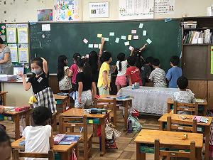 1年生は5校時、算数の時間でした。「ピンク、きいろ、きみどり、みずいろの紙から好きなものを選んで、名前を書いて黒板に貼ってください」という指示がありました。子どもたちは、選んで黒板に貼りました。「どの色の紙が多いですか?」の発問に、それぞれの色のときに手を挙げています。「比べるのにどうしたらいいですか?」の発問の後、側ごとに紙を移動し始めました。子どもたちが真剣に考えるよい授業でした。