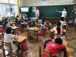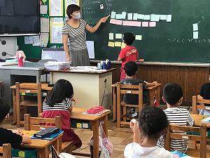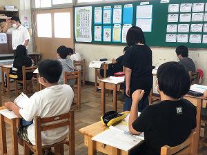 2年生は、2校時算数の学習で、担任の菱沼先生、学力向上担当の加藤先生、支援の川田先生の3名の先生方に教えてもらいました。まとめの後の復習をする場面でした。数直線に数字を書く問題やdL、L、mLの問題、足し算・引き算の問題です。分からない子に寄り添いながら、丸をつけながらです。頑張っていた2年生でした。