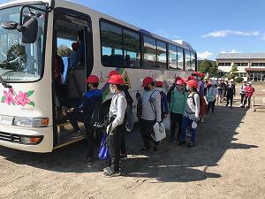 今日、5年生は稲刈り体験とわらでっぽう作り体験をしました。スクールバスに乗って、みどりの村に出発しました。みどりの村で開会式が子どもたちの司会のもとで行われました。その後、稲刈り鎌をもって、稲刈りです。子どもたちは手際よく稲刈りができました。