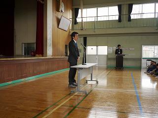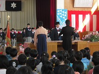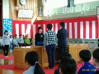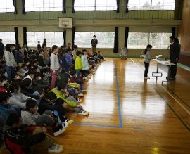 ピアノの修礼で始まり、開式の言葉、国歌斉唱の後、児童代表の発表がありました。今回は、1年生と5年生が発表をしました。3学期に頑張ったこと、1年間を振り返って、うれしかったこと、次年度への抱負などについて、しっかりとした口調で発表されました。その後、学校長から、思いやりの心、チームワークのすばらしさ・大切さについての話がありました。