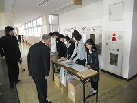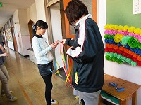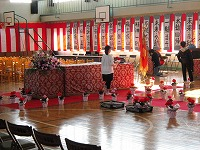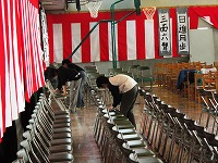 会場の体育館に列をそろえて椅子やテーブルを並べ、きれいに拭き、国旗と市旗を掲げ、トイレや廊下、昇降口などの清掃も行いました。また、来賓控室や6年生教室の飾り付けなども行いました。