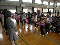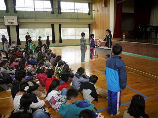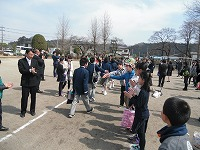 春の日差しが降り注ぐ中、子ども達が普段より1時間遅い登校で集まりました。先日卒業した6年生達も参加して、本日、児童と転退職者との別れの会、「離任式」が体育館で行われました。