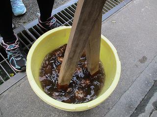 「いも煮づくりの体験活動」では、土いもを昔ながらの道具で洗いました。児童は、初めての体験であり、なかなか上手に洗うことはできませんでしたが、回数を重ねるたびに上手に使いこなせるようになりました。