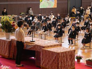 お家の方に手を引かれ、桜の花びらがひらひらと舞う中、登校し入学式に臨みました。