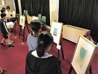 川上澄生美術館の事業です。本校にも10月2日(月)~10月6日(金)に視聴覚室に展示していただきました。今日は、学芸員の方が来校して、4年2組の子どもたちに作品の鑑賞のコツ「第1印象を大切にすること、色や形をよく見ること、名探偵になること(よく見て、いろいろなものを見付けること)」を教えてくださいました。