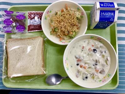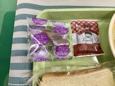 献立は「食パン、チョコ、パリパリサラダ、シエニー・ケイット、果汁グミ」です。
