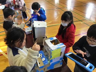 お客さんは1年生と先生方です。2年生は1か月前から「どのようにしたらおもちゃの動きがよくなるのか」「お客さんに楽しんでもらうためにはどんな工夫をすればよいか」などについて話し合い、準備を進めてきました。