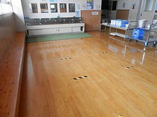 また、こまめな手洗いやうがいの指導をしていますが、手洗い場の数に限りがあるため、手洗い等の順番を待っている間児童同士が密集しないよう、廊下に印を付け間隔をあけるようにしています。