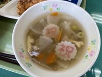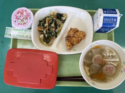 わかめご飯、牛乳、から揚げ、胡麻和え、お祝い吉野汁、お祝いゼリー